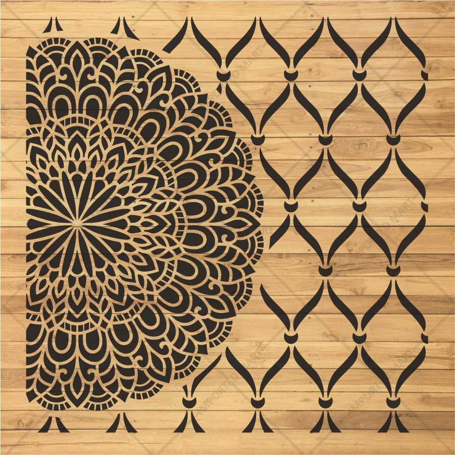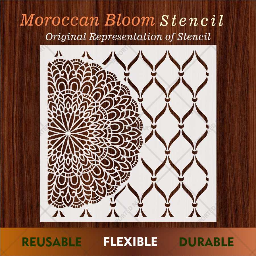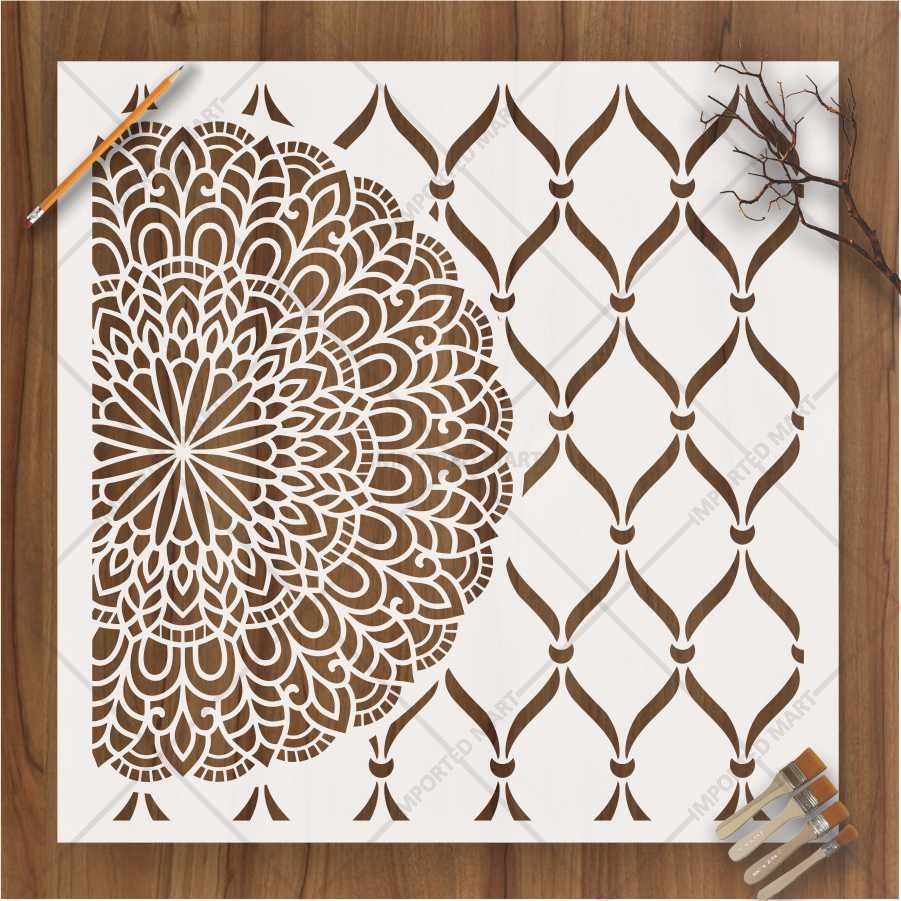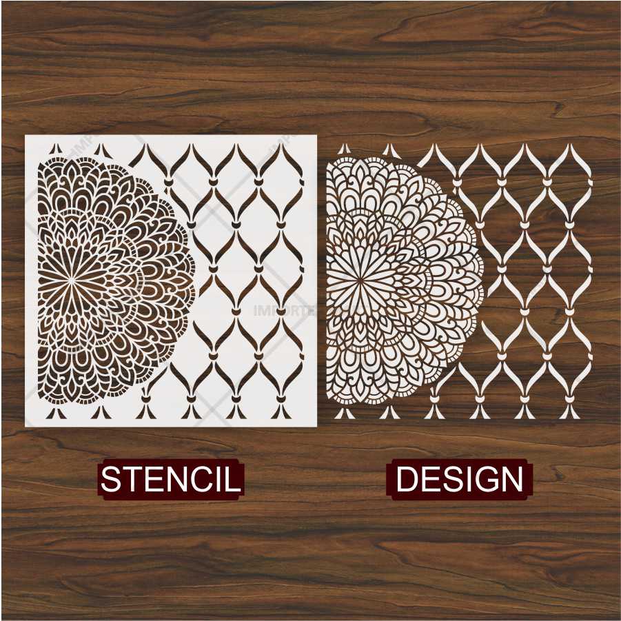 Enhance your décor with this elegant Mandala Bloom & Moroccan Mesh stencil—perfect for walls, wood panels, fabrics, and floor art. This dual-design stencil combines a half mandala floral pattern with a stylish Moroccan lattice, ideal for ethnic, boho, and fusion interiors. Use it on concrete walls, furniture, tiles, glass, and canvas for detailed DIY creativity. Made by Imported Mart Stencils – visit www.imartdecor.com for more creative stencil templates.