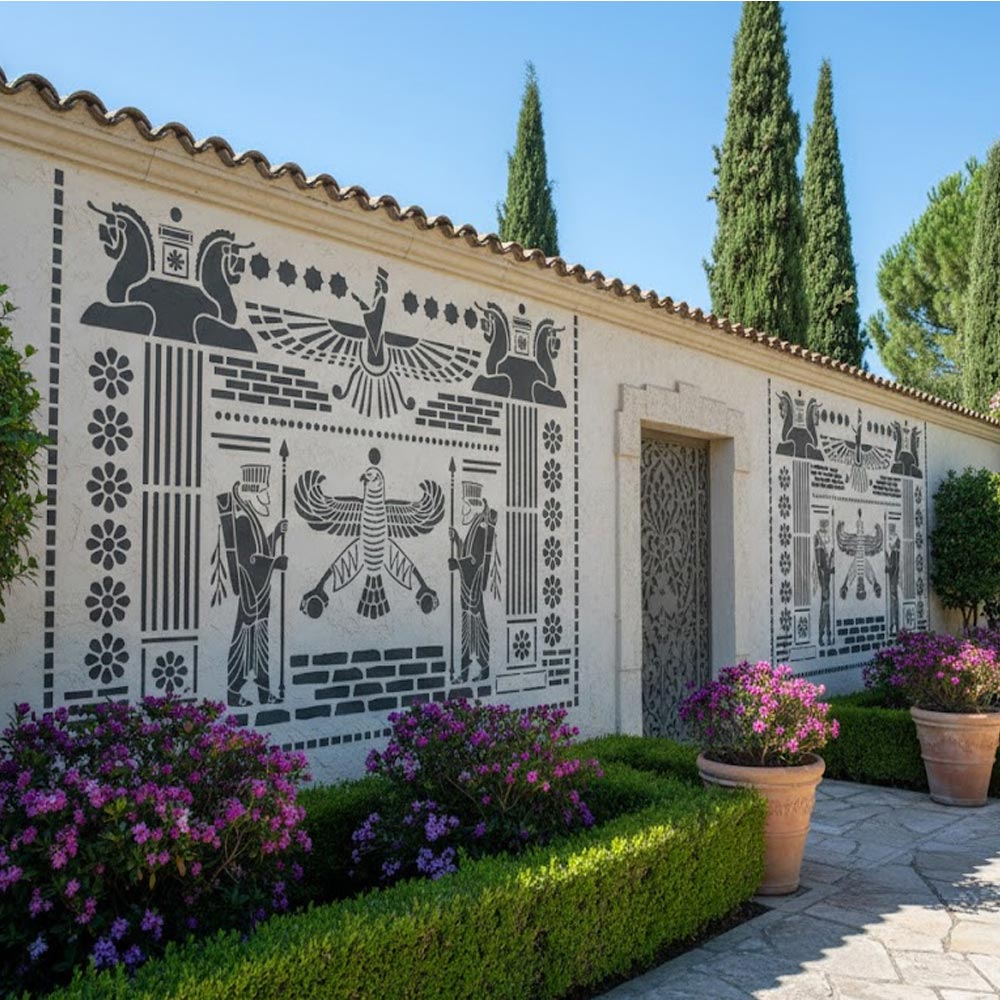 Bring the grandeur of ancient empires into your décor with this Ancient Persian Frieze stencil, featuring royal guards, winged eagle motifs, and classical palace ornamentation.