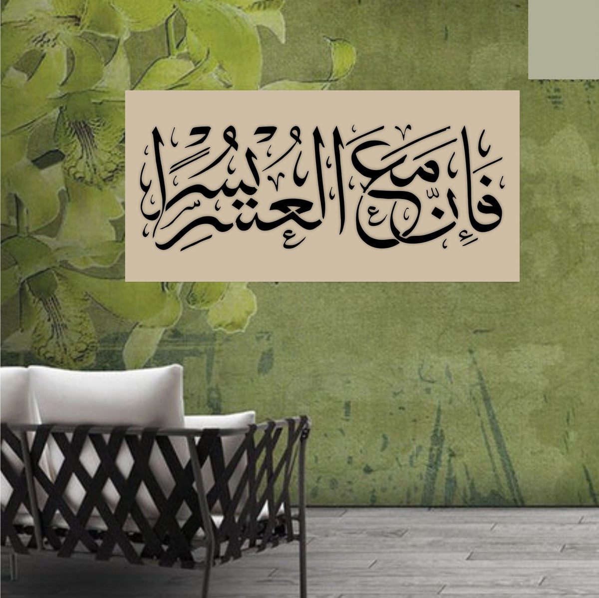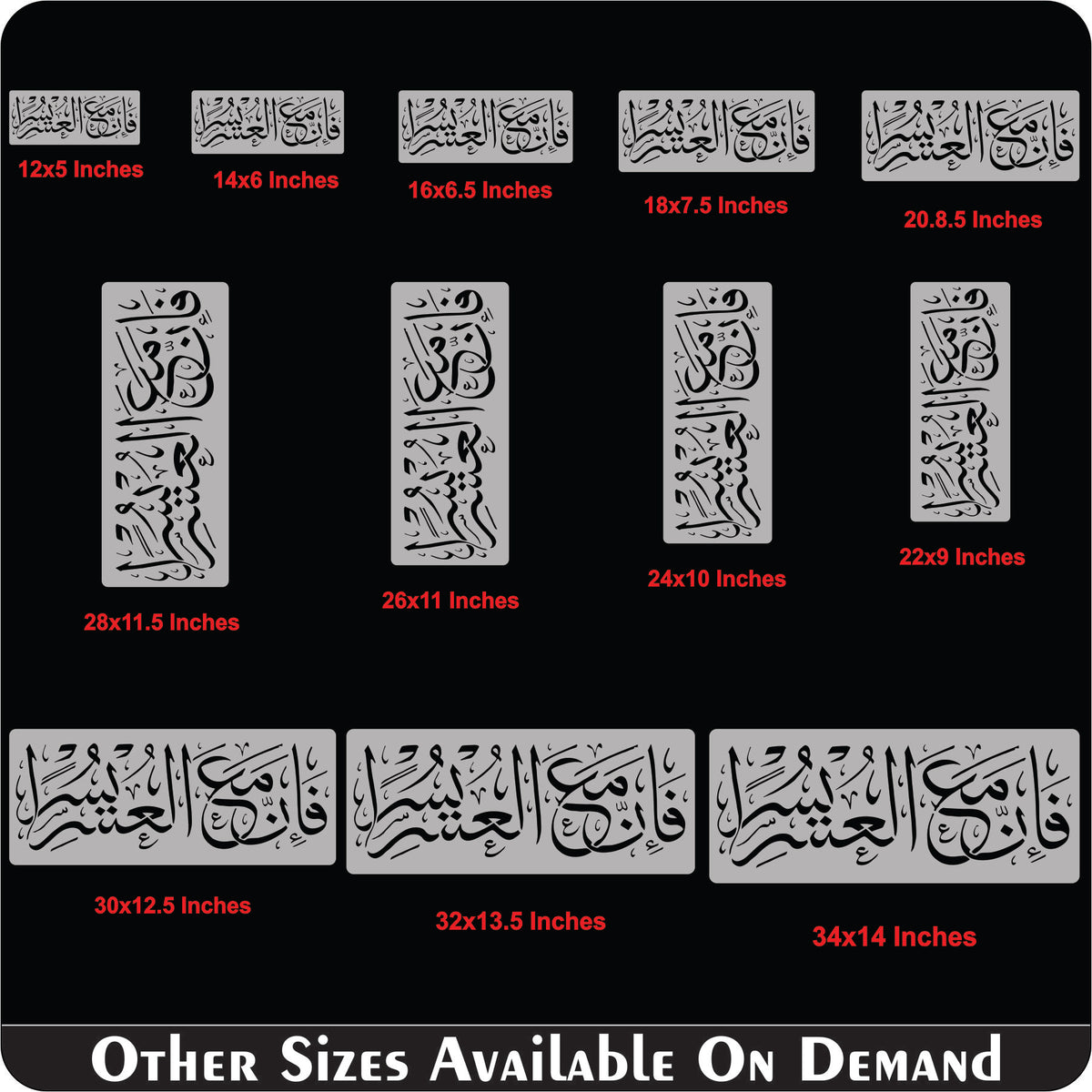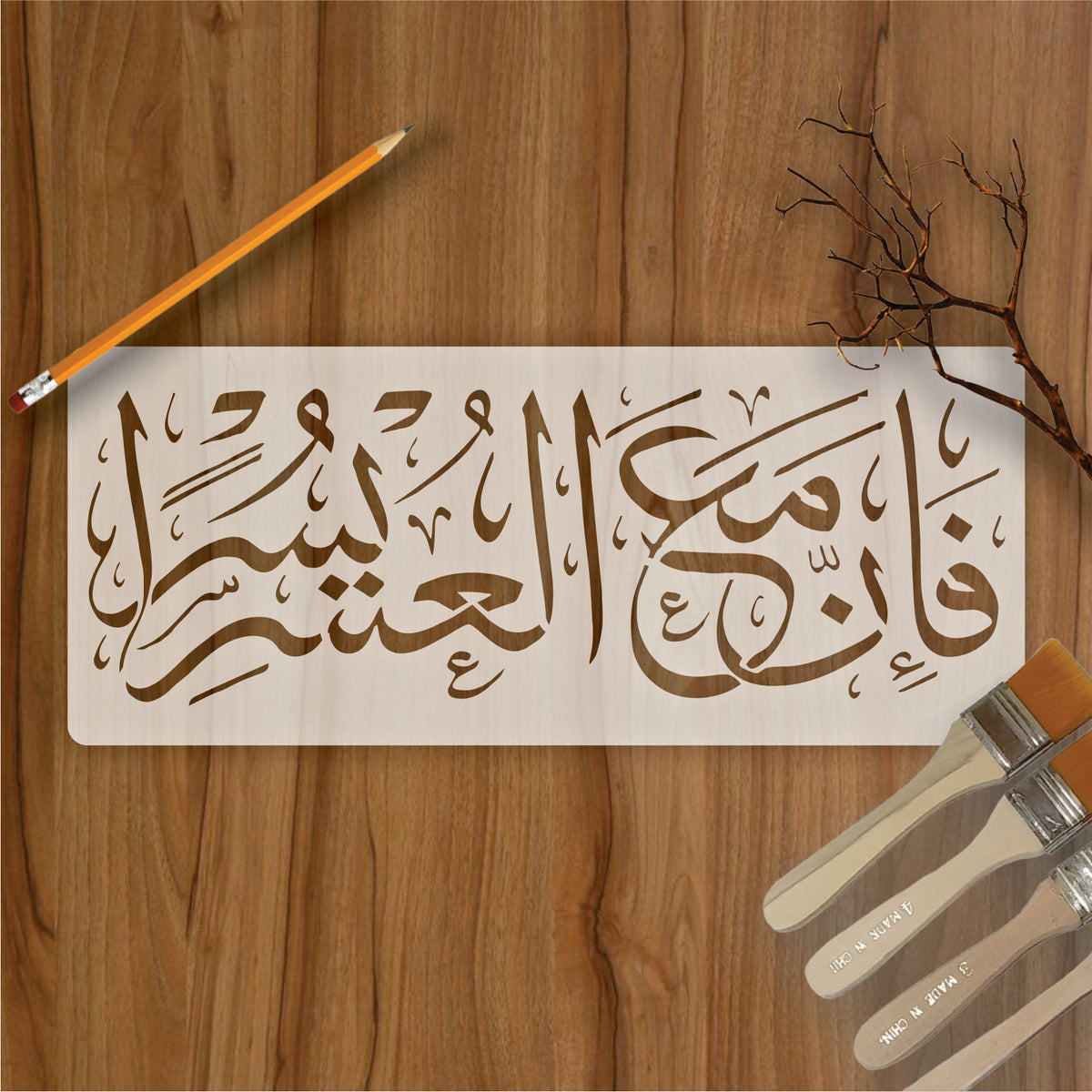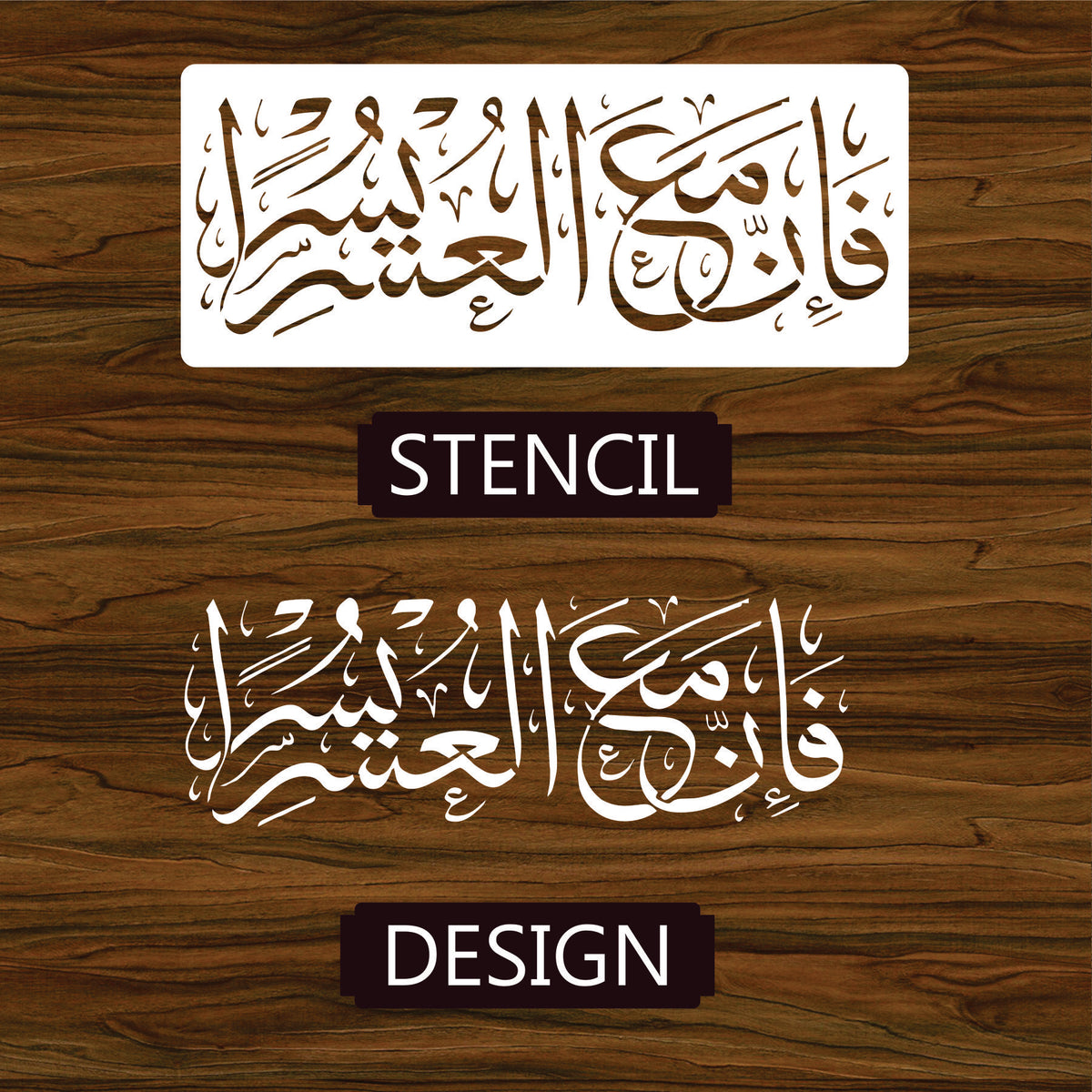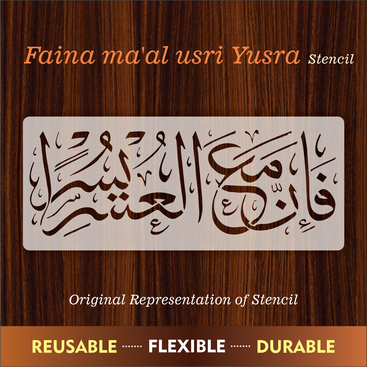 Islamic Calligraphy Stencil of Fa Inna Ma'al Usri Yusra For wall decoration, used for Canvas and scrapbooking, Our wall stencils are unbreakable and reusable, which can be used with different kinds of paints and techniques, find more calligraphy stencils, floral stencils, Mandela stencils, in our store.