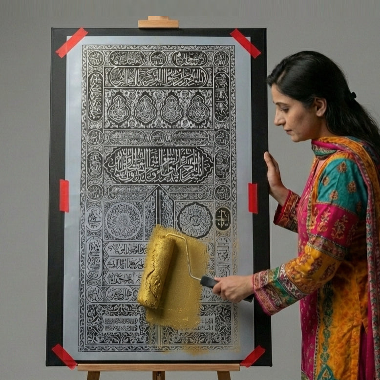 Enhance your space with this premium Kiswa-e-Kabba stencil inspired by the sacred Kaaba door design, perfect for Islamic and spiritual décor.