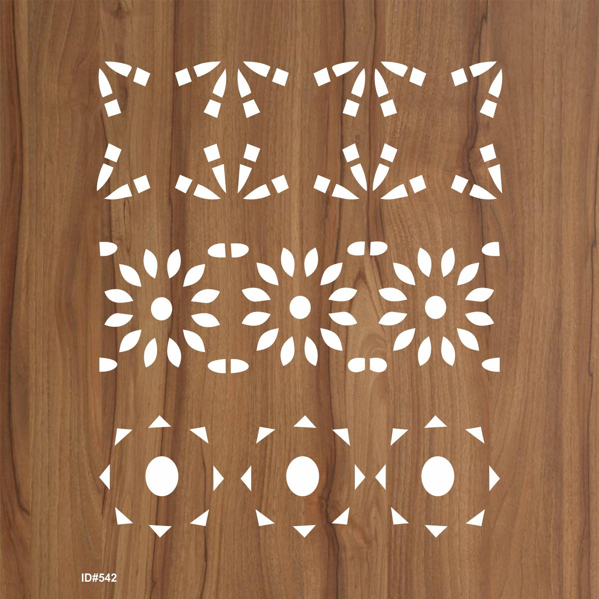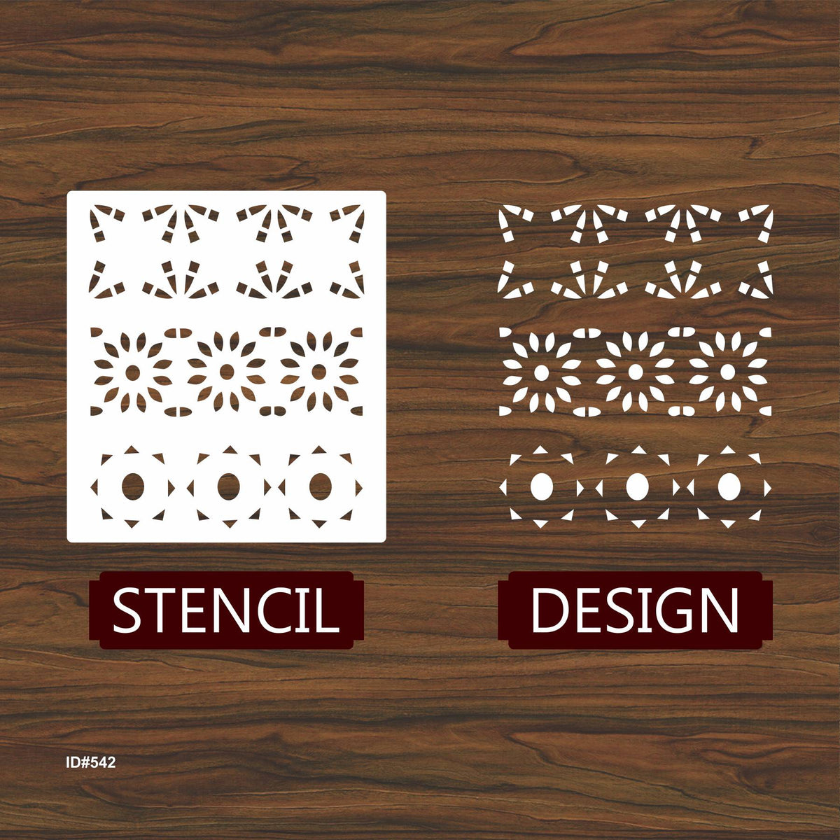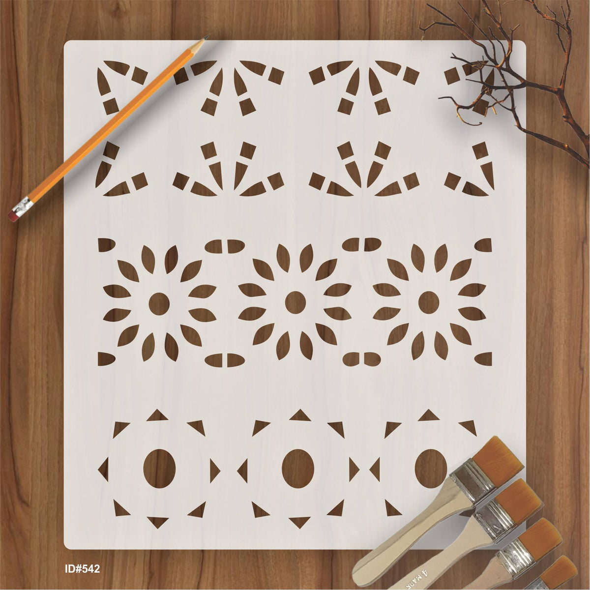 This stencil features a blend of floral blooms and geometric shapes, ideal for borders, tiles, and creative wall patterns.