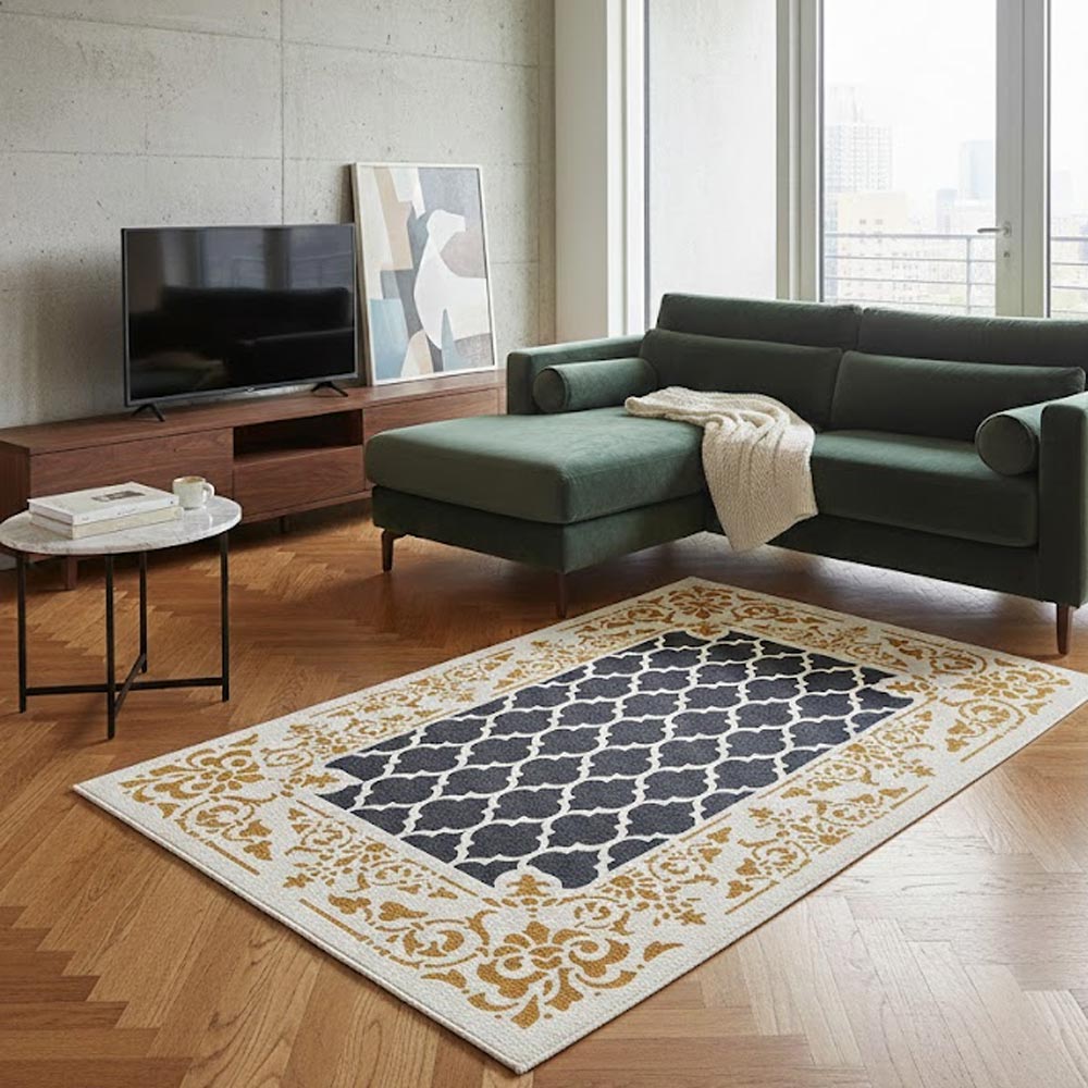 This Arabic-inspired carpet design works beautifully for boho, Islamic, vintage, and luxury interiors.