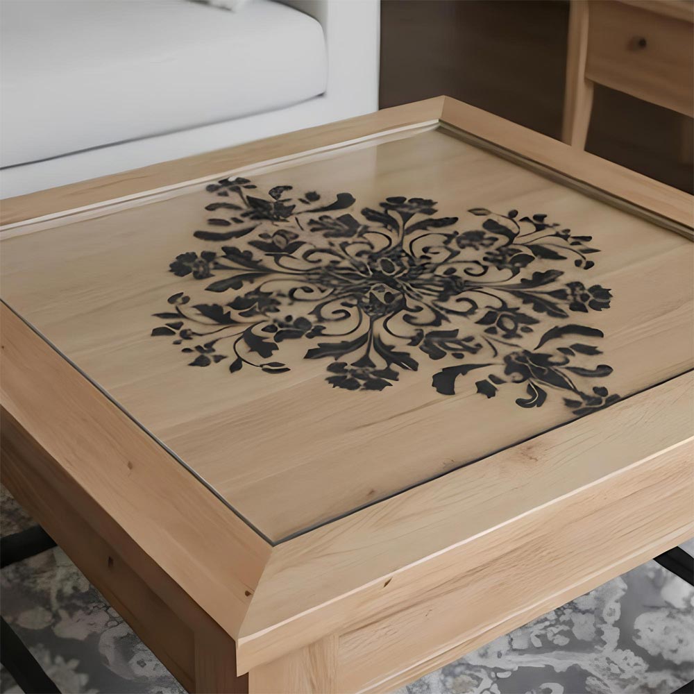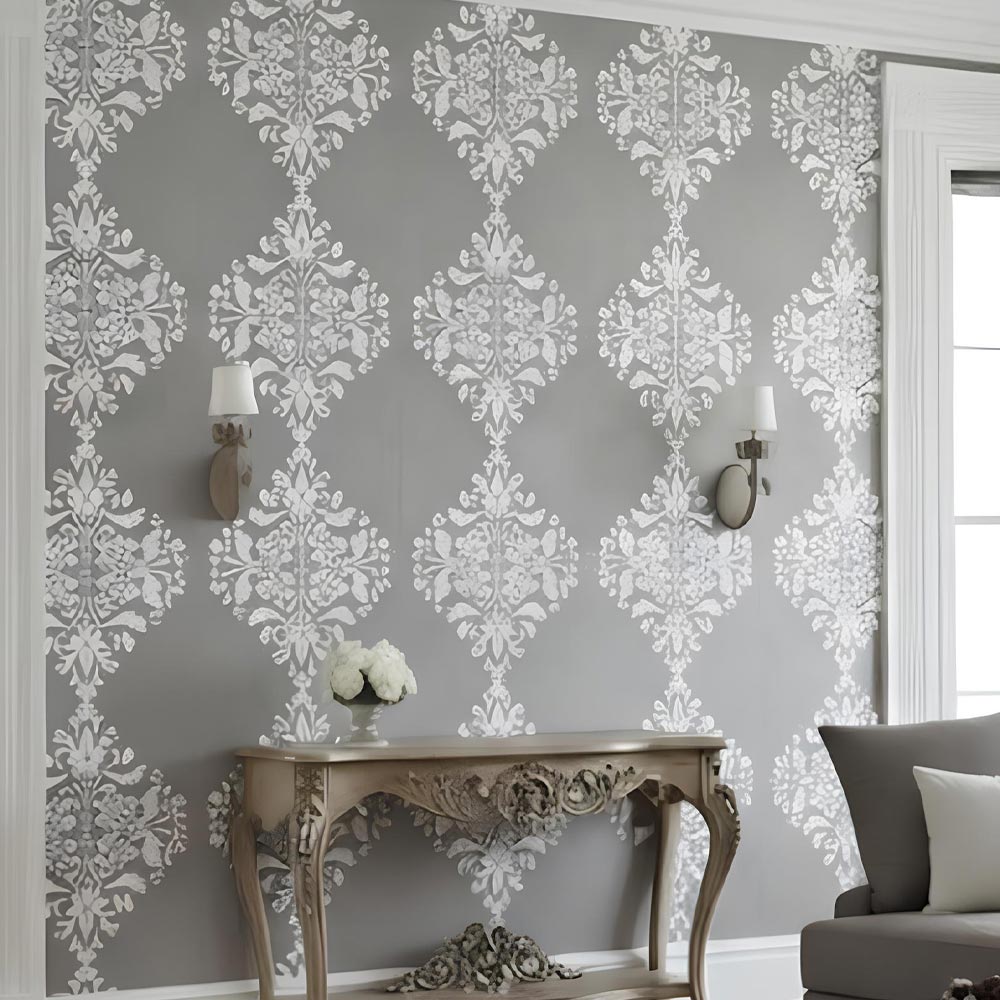 Transform your interiors with this reusable Royal Damask Stencil, ideal for walls, floors, furniture, fabric, canvas, tiles, and wood surfaces.