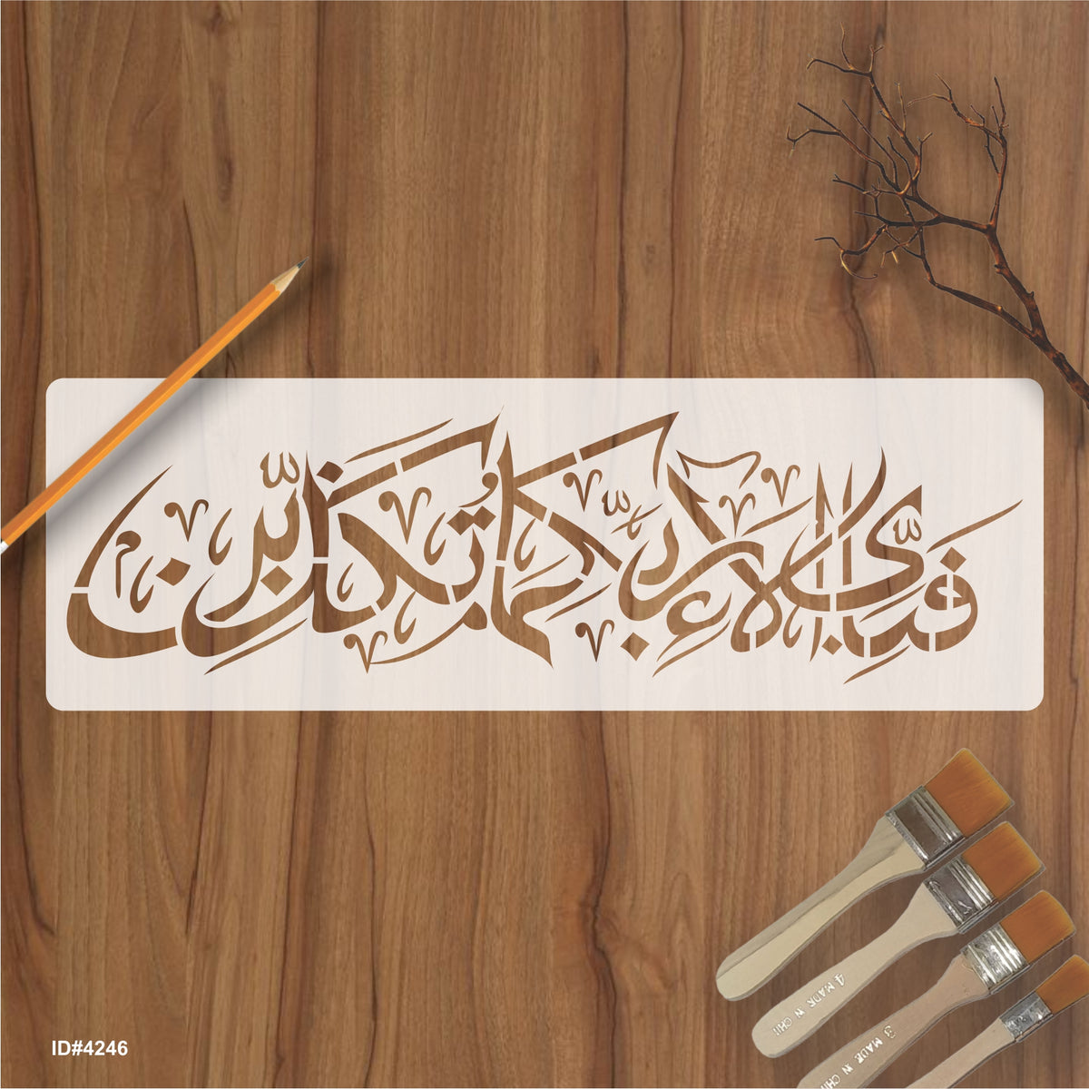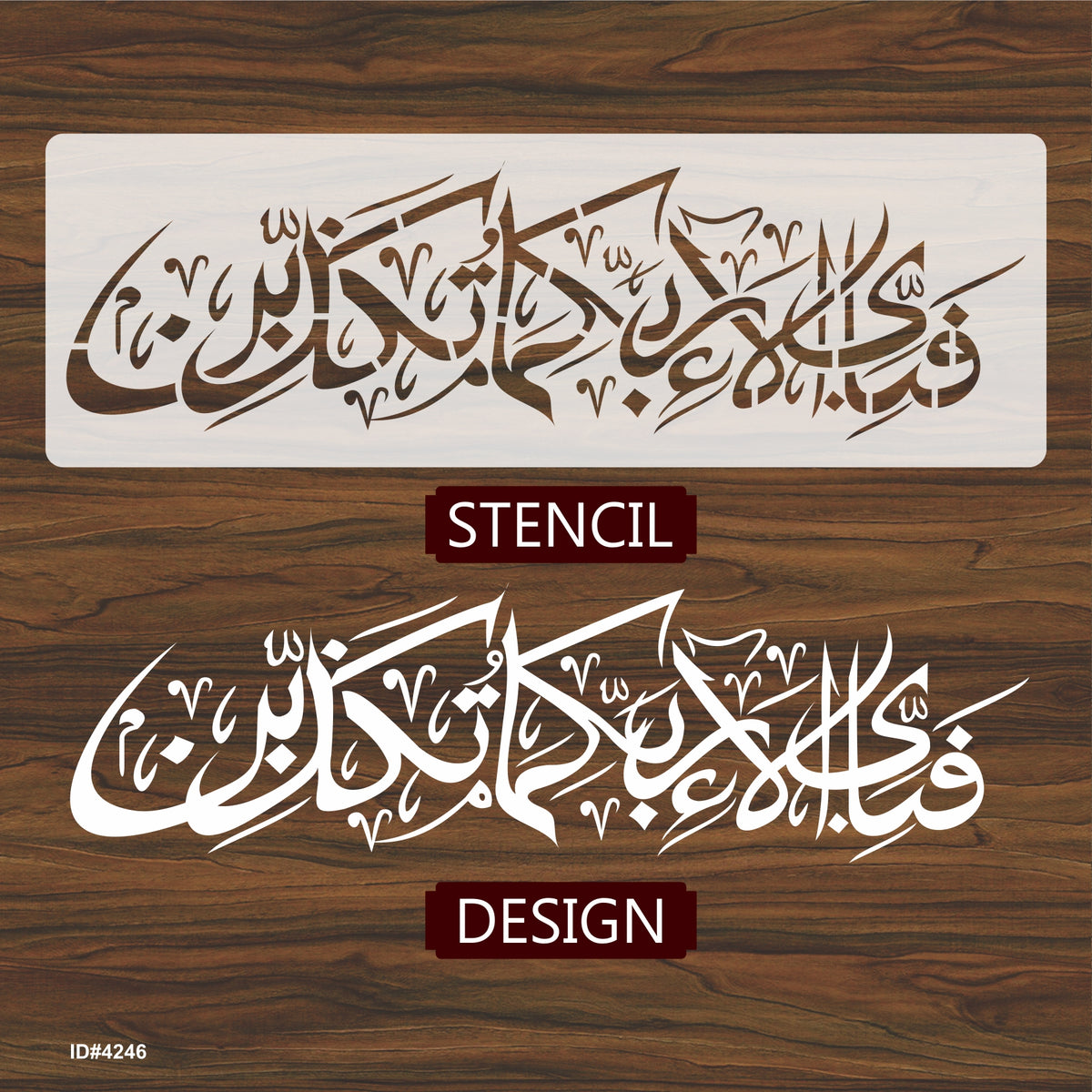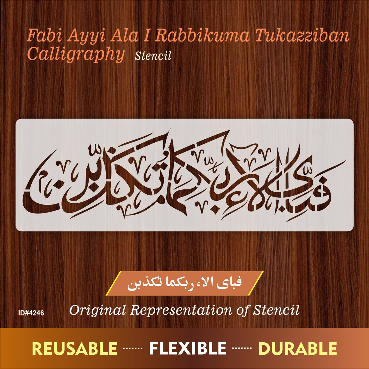Islamic Calligraphy Stencil of Fabi Ayyi Ala I Rabbikuma Tukazziban For wall decoration, used for Canvas, and scrapbooking, Our wall stencils are unbreakable and reusable and can be used with different kinds of paints and techniques, find more calligraphy stencils, floral stencils, and Mandela stencils, in our store.