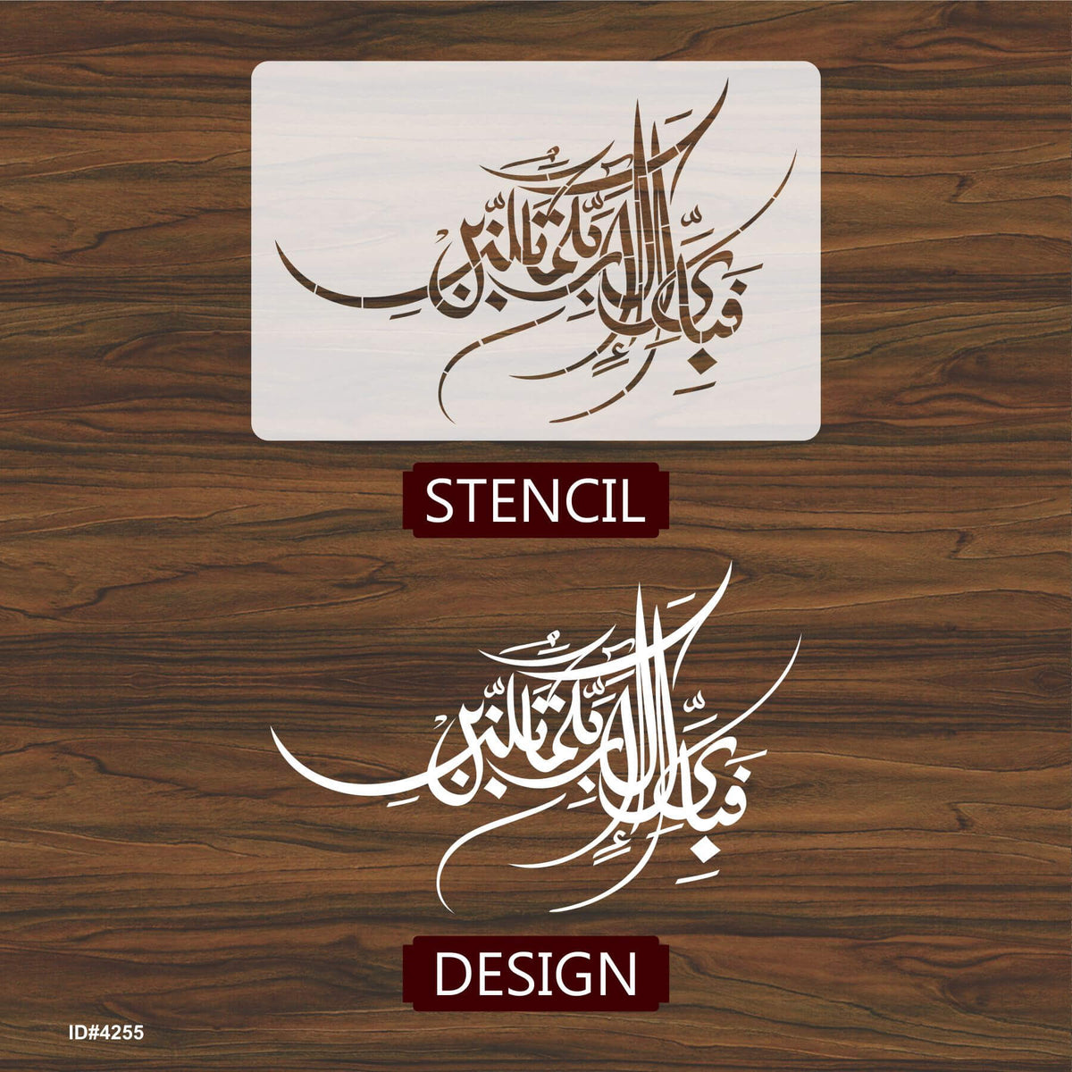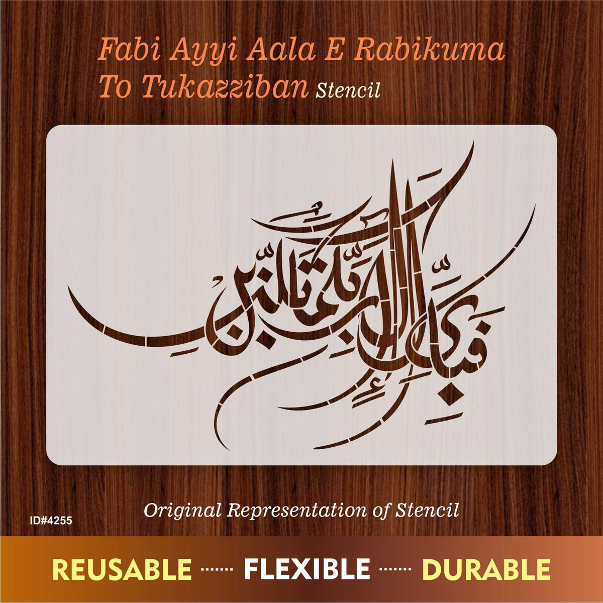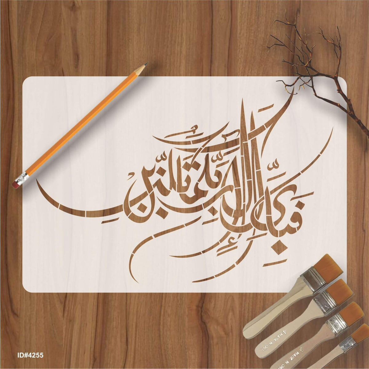 Islamic Calligraphy Stencil of Fabi Ayyi Ala I Rabbikuma Tukazziban (55. Ar-Rahmaan) For wall decoration, used for Canvas, and scrapbooking, Our wall stencils are unbreakable and reusable and can be used with different kinds of paints and techniques, find more calligraphy stencils, floral stencils, and Mandela stencils, in our store.