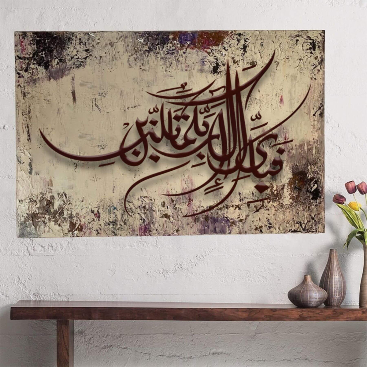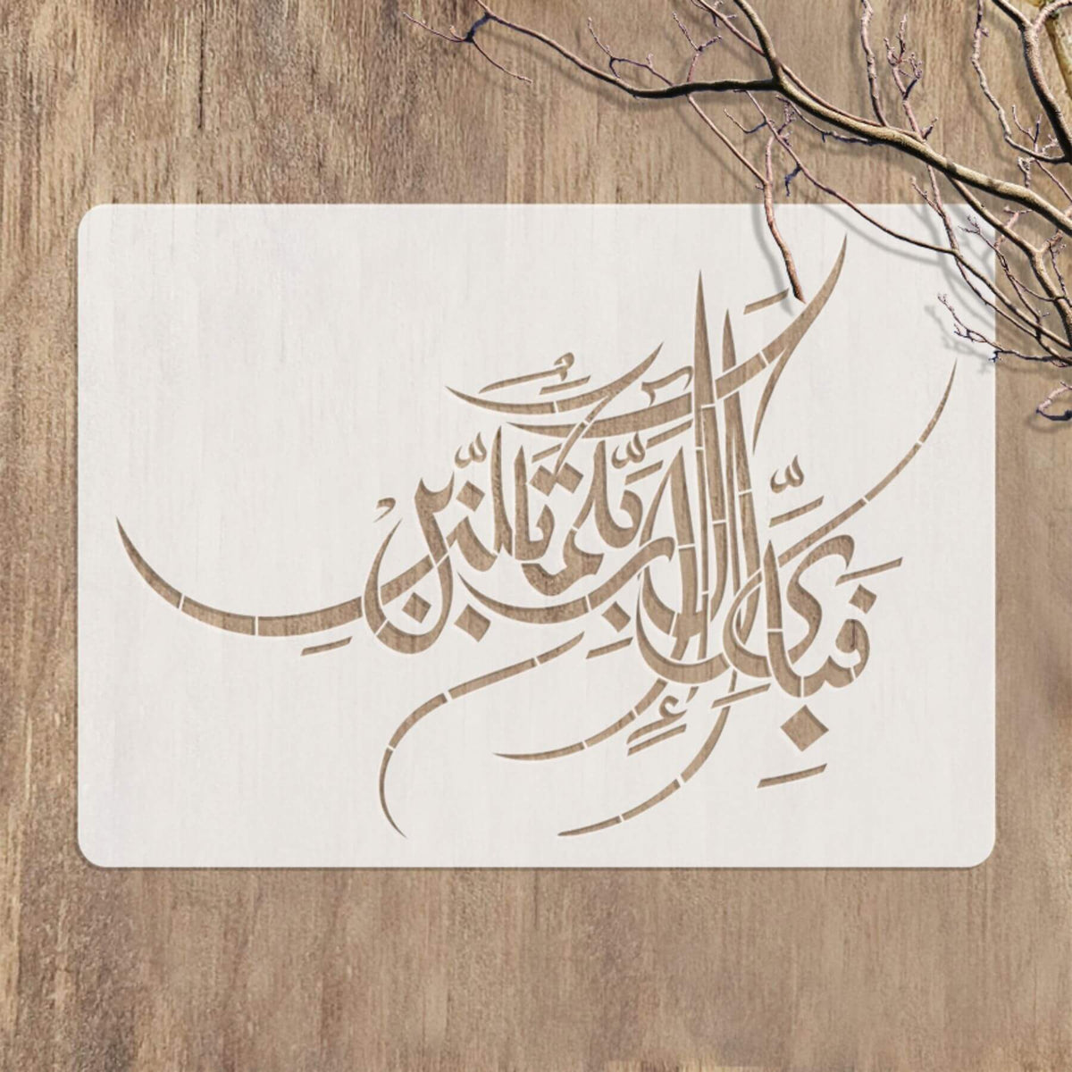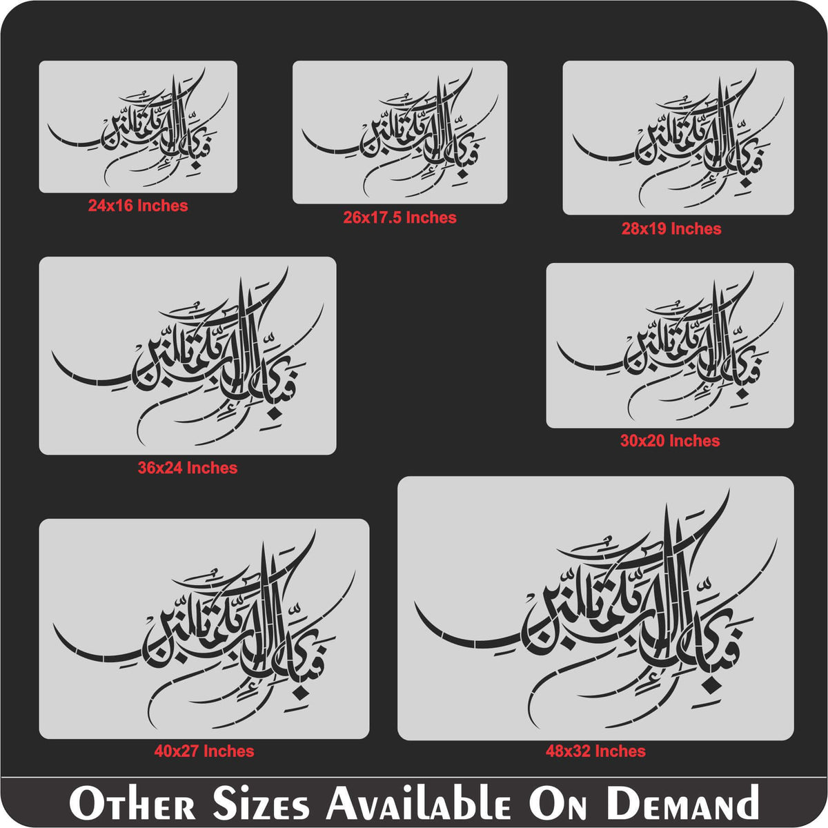 Islamic Calligraphy Stencil of Fabi Ayyi Ala I Rabbikuma Tukazziban (55. Ar-Rahmaan) For wall decoration, used for Canvas, and scrapbooking, Our wall stencils are unbreakable and reusable and can be used with different kinds of paints and techniques, find more calligraphy stencils, floral stencils, and Mandela stencils, in our store.