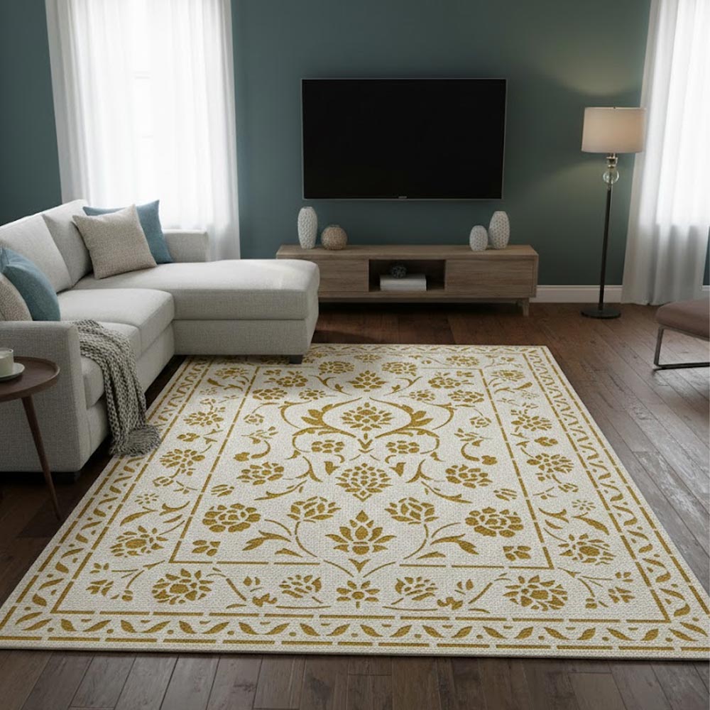 The vintage Mughal-inspired floral pattern with decorative borders creates a rich, classic, and luxurious look.